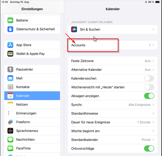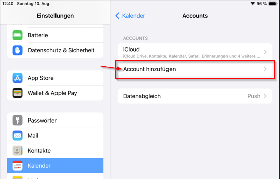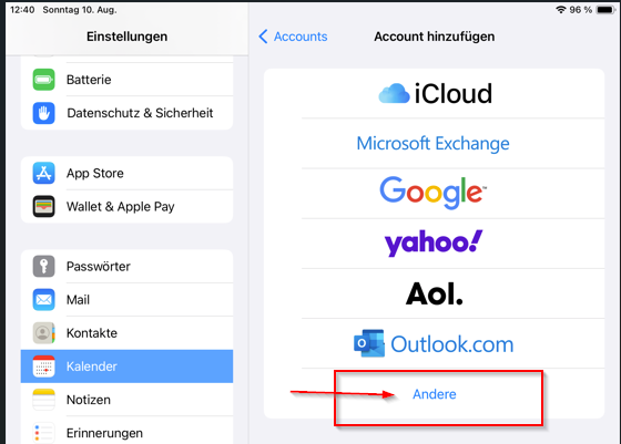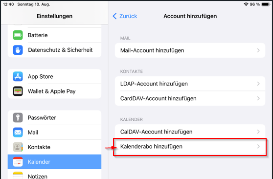 sollte die oben angeführte Methode nicht funktionieren, kann der Kalender über die Einstellungen hinzugefügt werden.